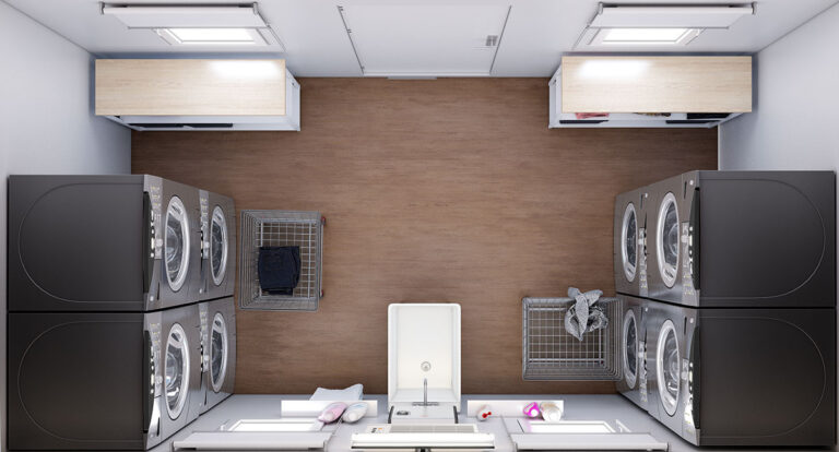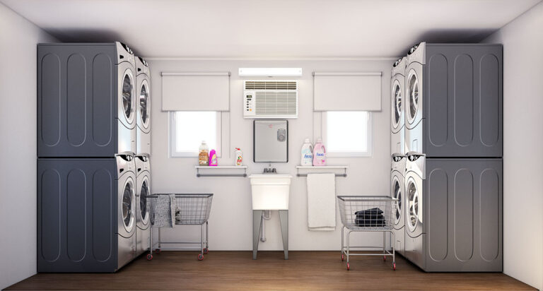 The UPLIFT™ Laundry unit offers a durable and insulated solution for portable laundry needs. Designed for security and convenience, the unit includes a lockable door and provides 112 ft² of space (14′ L × 8′ W).