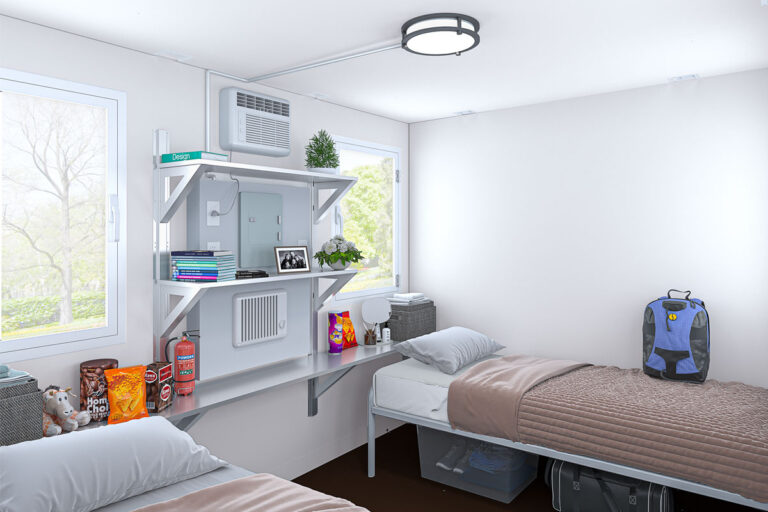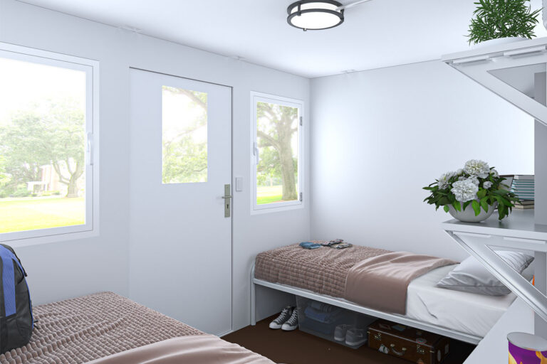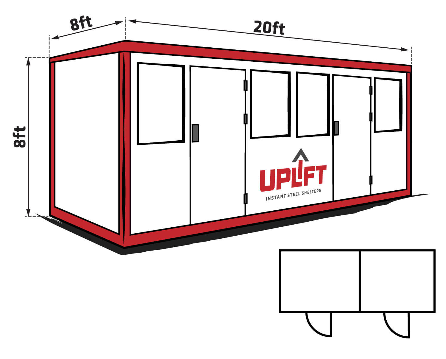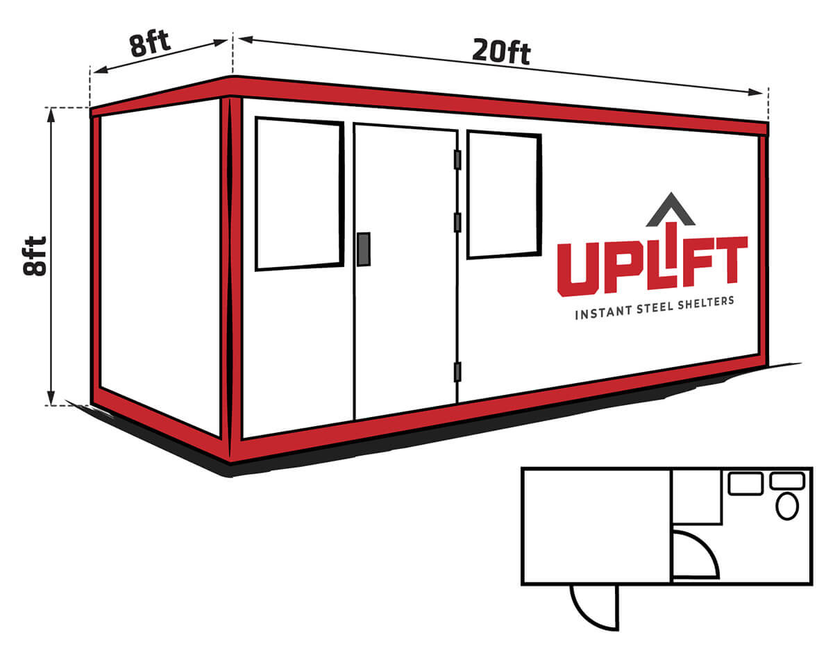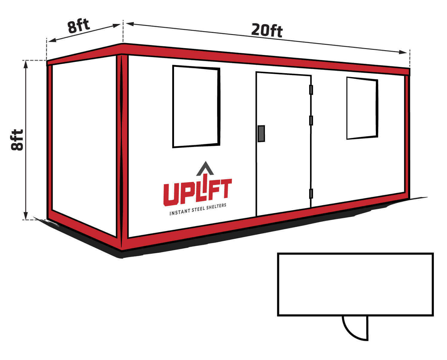 All UPLIFT™ Shelter models rest on a 6″ steel base with an integrated structural floor. Each unit includes forklift sleeves for easy relocation and is certified to withstand snow loads up to 50 psf and winds up to 170 mph. Operable windows compliant with egress code requirements, lockable doors, “Griptonite” anti-slip floors, and optional shelving provide a safe, secure, and comfortable living environment.